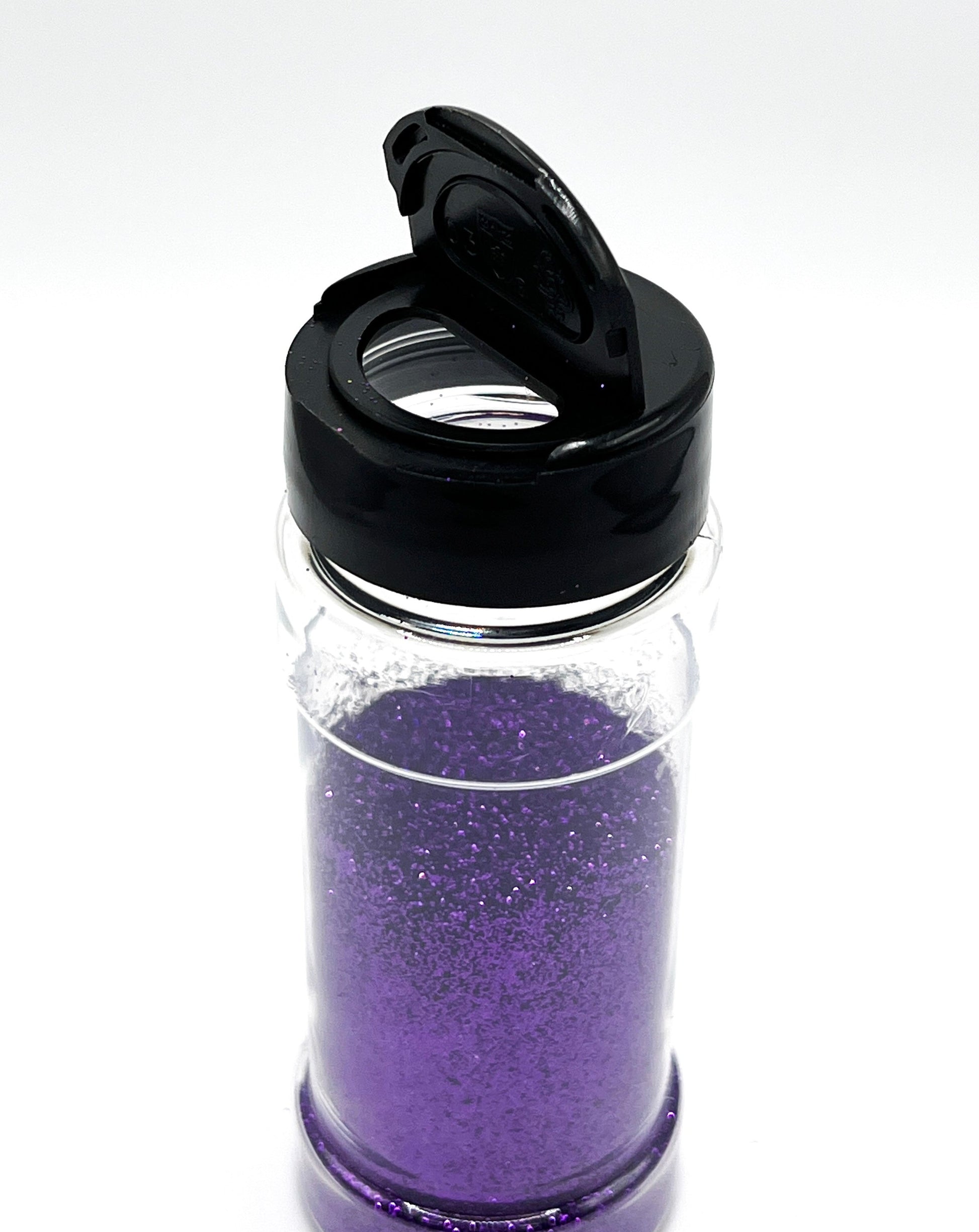 These clear jars have a black flip top that allows you to control your glitter application and a hole size that fits all glitters.